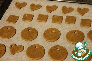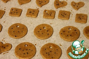 Вырезать печенье с помощью формочек или можно просто нарезать на квадраты. Выложить на противень застеленный пергаментом.
