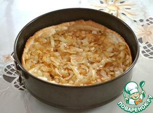 Пока печется корж, мелко нарезать лук и обжарить его на сковороде до румяного цвета. Жарить в минимальном количестве масла, а лучше без него, если позволяет сковорода. -