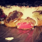 Можно чередовать начинку в эклерах, когда будете укладывать их в форму, т. е. крем с розовым красителем, с желтым, эклер с какой-нибудь кисло-сладкой ягодой внутри. Ягода там будет очень кстати.