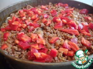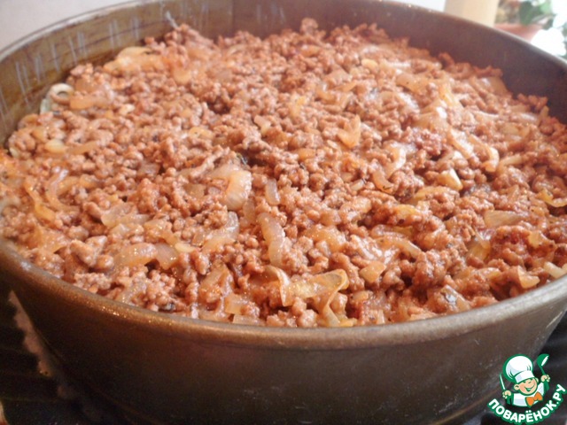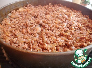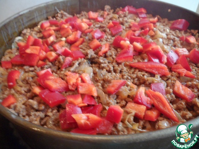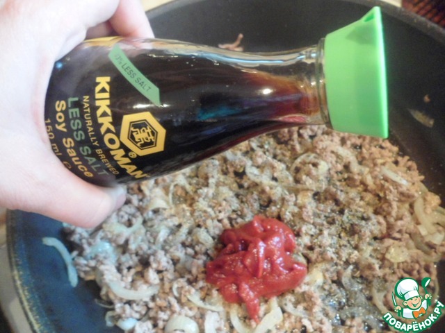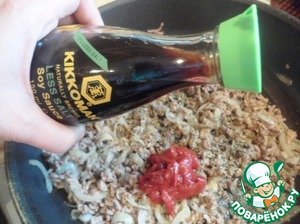 Нарезать 2 средние луковицы полукольцами, обжарить, добавить фарш, томатную пасту, 1/2ч. л. гранулированного чеснока, базилик и 1ст. л. соевого соуса ТМ «Киккоман». тушить до готовности.