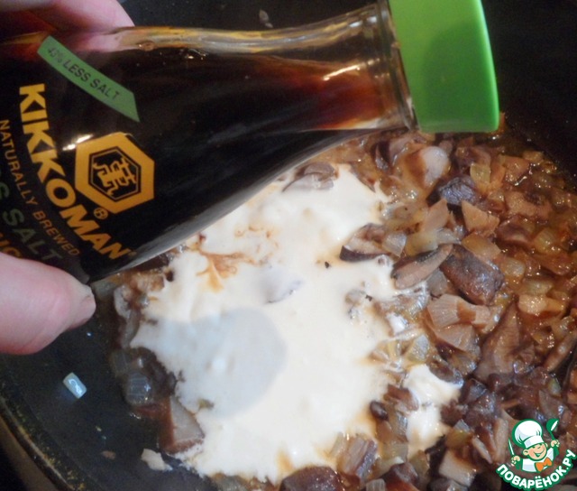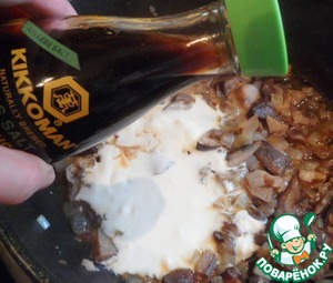 Нарезать мелко луковицу и обжарить с порезанными грибами (у меня замороженные подберезовики). Добавить сметану, базилик и 2ст. л. соевого соуса ТМ «Киккоман». Потушить 5 минут.