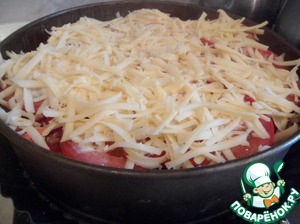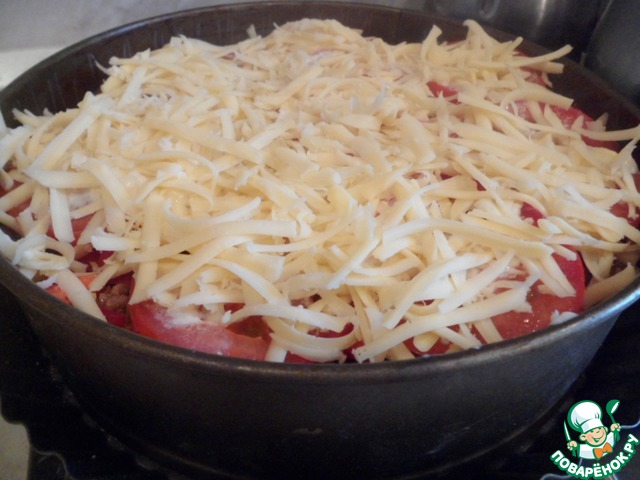 Далее посыпать ¼ стакана тертого сыра и запекать в духовке минут 30 до золотистого верха.