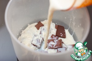 Растопите шоколад (я немного подержала в микро). Смешайте молоко и инвертный сироп (заменила медом), подогрейте и влейте к шоколаду. Перемешайте, а еще лучше пробейте блендером.