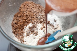 Просейте в миску муку, добавьте коричневый сахар (у меня сорта Мусковадо), разрыхлитель и соду, влейте к сухим ингредиентам шоколадную смесь, быстро и деликатно перемешайте силиконовой лопаточкой, лишь до объединения ингредиентов.