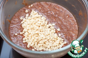 Добавьте мелко порубленный шоколад или шоколадные капли. Я добавила белые, которые впоследствии растворились в маффинах и были практически не заметны. К сожалению (