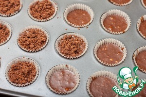 В формочки вставьте бумажные манжетки и распределите по ним тесто, заполняя на 2/3, т. к. маффины очень хорошо поднимаются. Сверху обильно присыпьте шоколадным штрейзелем. Получается более 20 маффинов среднего размера. Я готовила полпорции и выпекала мини-кексы, получилось около 30.