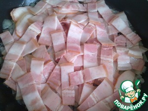 Бекон нарезать небольшими полосками и добавить к поджаренному луку. Хорошо перемешать.