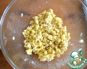 Холодное масло порубить с сухой смесь и перетереть всё руками в крошку.