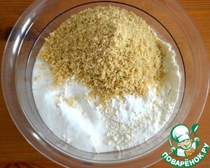 В большую миску просеять муку с разрыхлителем, добавить сахар, щепотку соли и измельченные орехи.