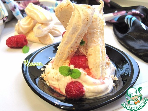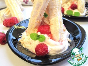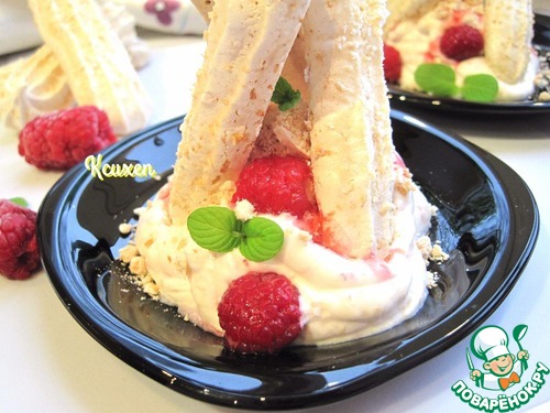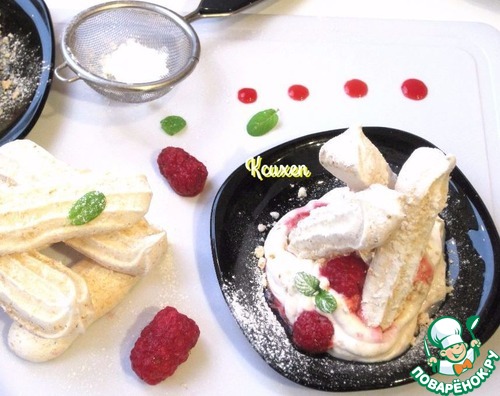 Формируем десерт: в креманки или в десертные тарелочки выкладываем горкой крем, добавляем ягоды малины и несколько капель малинового пюре, присыпаем крупно-раскрошенным безе, вокруг устанавливаем целиковые палочки-безе, как бы формируя заборчик. Украшаем листочками мяты. Десерт готов. Прошу всех к столу!