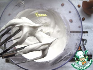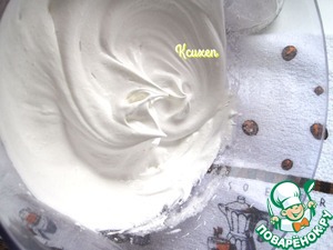 Как только белки начнут вспениваться, увеличиваем обороты миксера и взбиваем белки, постепенно подсыпая сахар. Продолжаем взбивать на высокой скорости миксера, добавляя сахарную пудру.