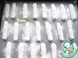 Во взбитые белки осторожно вмешаем кокосовую стружку. Переложим смесь в кондитерский мешок и выдавим на противень палочки, длинной около 12-ти см. У меня получилось 22 палочки. Каждую палочку сверху присыпаем небольшим количеством кокосовой стружки, затем сахарной пудрой. Выпекаем палочки-безе в течении часа или до лёгкого карамельного оттенка. Духовку выключаем и даём палочкам полностью остыть в духовке. В процессе выпекания и остывания палочек духовку не открываем ни в коем случае!