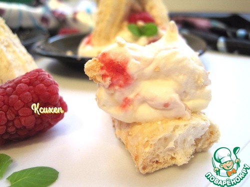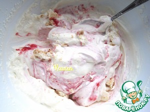 В сливки добавляем немного малинового пюре и слегка перемешиваем ложкой так, что бы крем не превратился в однородную массу. Малина в креме должна оставаться "прожилками". Не обязательно использовать всё малиновое пюре, консистенция крема не должна стать текучей, крем по прежнему должен держать объём. 3 палочки-безе крупно раскрошим руками и немного крошек вмешаем в крем.