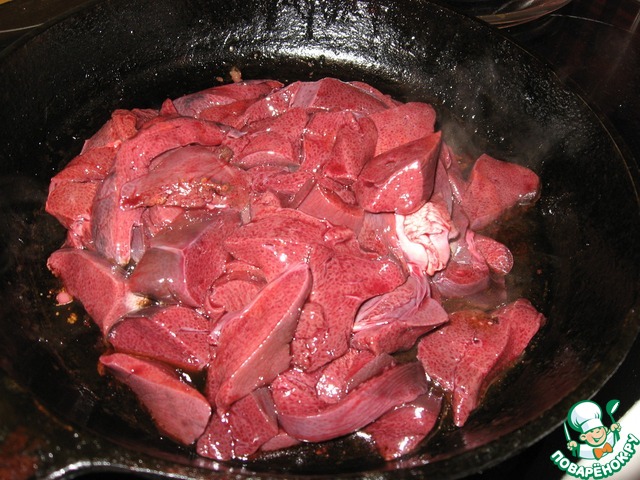 Раскалите сковороду, растопите на сковороде половину сливочного масла, нарежьте кусочками печень и быстро обжарьте её со всех сторон