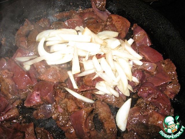 Добавьте к печени лук и обжаривайте всё вместе около 5-7 минут. Накройте сковороду крышкой и снимите с огня