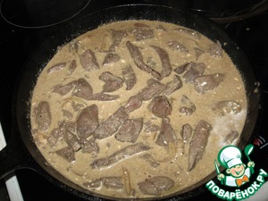 Верните на плиту сковородку с печенью, добавьте к ней пюре из грибов, приправьте соевым соусом, свежемолотым перцем, добавьте сливки и паприку