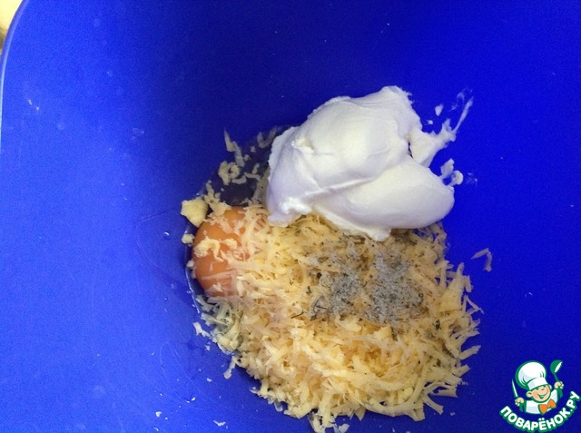 Яйцо разбить в миску, добавить специи, сметану и сыр, натертый на средней терке. -