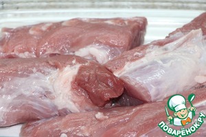 Разрезать мясо на 4 куска, выложить в неметаллическую емкость.