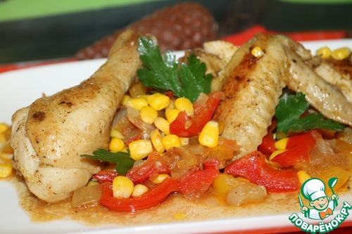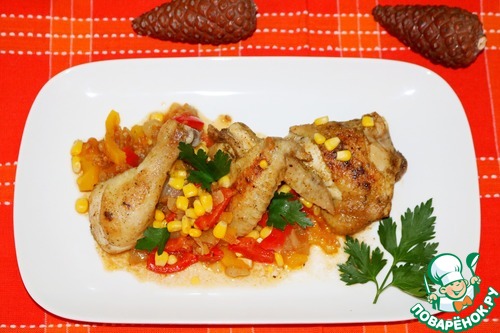 • Посыпаем кукурузой. И готовим под крышкой, на медленном огне 15 минут. Можно полить курицу кипящим соусом.