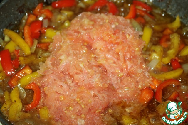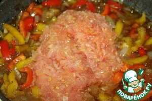 • Далее томаты. Перемешиваем, даём закипеть.