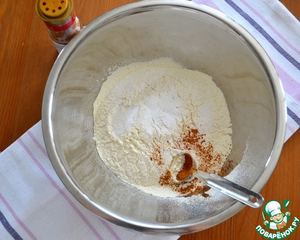 Отдельно в миске смешайте все сухие ингредиенты: просеянную муку, соду, соль и корицу.