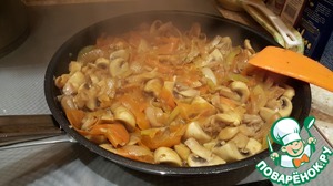 Подготовим ингридиенты. Нарежем лук, морковь, перец и грибы. Нальём на сковороду оливковое масло. Начнём обжаривать с лука.