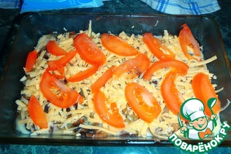 Убираем все в холодильник мариноваться. Через час достаем все и выкладываем на противень слоями: