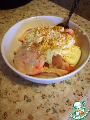 Курицу замариновать в сметане. Посолить, добавить специи по вкусу.