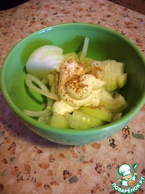 Нарезать лук полукольцами, посолить, поперчить и замариновать его так же в сметане.
