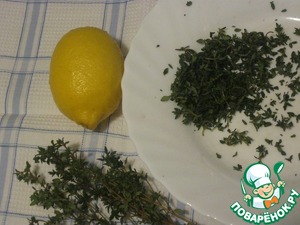 Понадобятся листочки свежего тимьяна. Второй важный ингредиент - лимон. Лимон тщательно помыть щеткой, снять цедру с помощью терки и выжать сок.