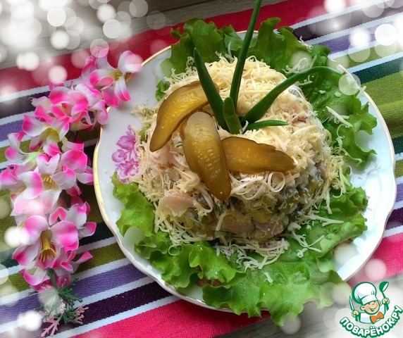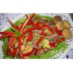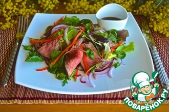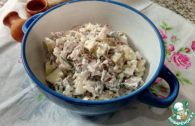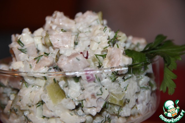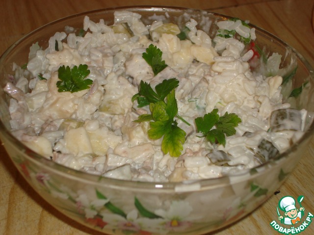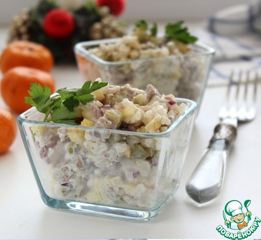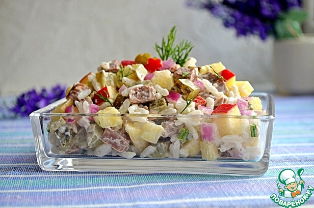 Очень вкусный мясной салат. Гармоничный, в меру пикантный с ярким послевкусием. Сытный, но не тяжелый. Достаточно доступный. Приятно украсит повседневный и праздничный стол! Угощайтесь!!!
