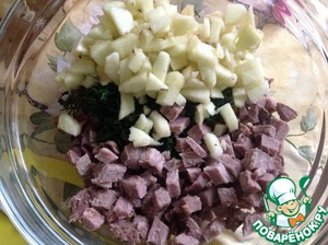Говядину нарезать маленькими кубиками. Яблоко очистить и тоже нарезать кубиками.
