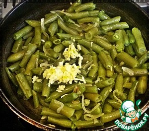 Лук порезать полукольцами и на сковороде обжарить до румяности. Затем добавить фасоль, чеснок, перемешать и обжаривать 3-4 минуты.