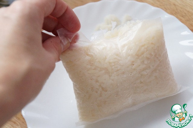 • Вынуть сварившийся рис, разорвать пакетик и прямо из пакетика разложить его по стаканам.