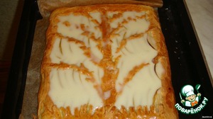 • Из меньшей части теста скатать жгутики, расплющить их руками, края нарезать ножом как бахрому. Выложить жгутики на слой яблок в виде дерева. Смазать желтком, поставить пирог в духовку и выпекать при 180 С в течение 30-35 минут.