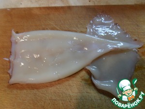 Кальмары очистить от кожицы. Опустить кальмары в кипящую воду на 20-30 секунд. достать и сразу же отправить под холодную воду