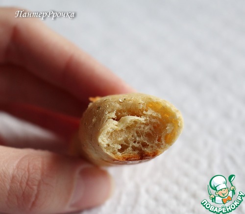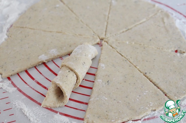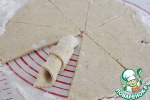 Поверхность стола слегка присыпать мукой. Тесто раскатать в круг диаметром 30 см. Разделить на 8 частей. Каждую часть скрутить в виде рогаликов.