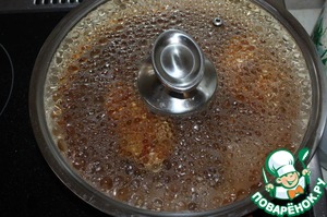 Вылить в сковороду маринад, в котором мариновалась курица, добавить устричный соус и немного воды.
