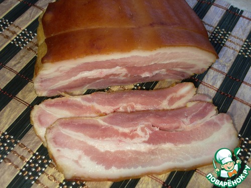Грудинка варено-копченая, копчение в дыму, придает натуральный цвет вкус продукту. В два раза дешевле покупной, и главное, вы знаете из чего она сделана.