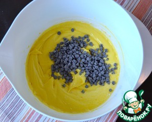 Добавить в тесто шоколадные капли (поломанный на кусочки шоколад) и перемешать.