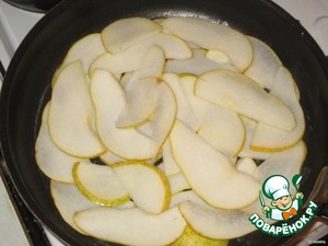 Сковороду смазать 15-20 г сливочного масла, выложить ломтики груши и аккуратно обжарить до мягкости и полупрозрачности груш.
