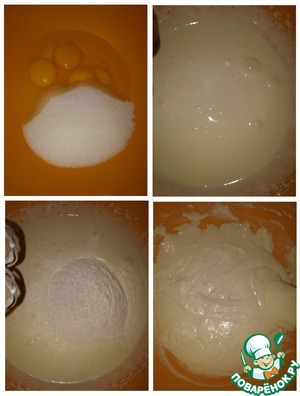К яйцам добавить ванилин и сахар, взбить 5 минут, за это время масса посветлеет и увеличится в размере,