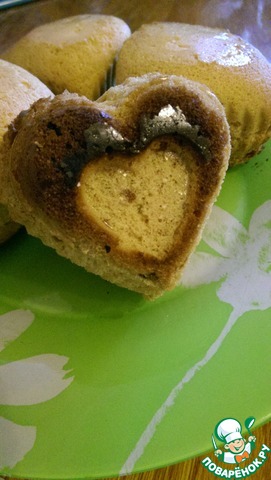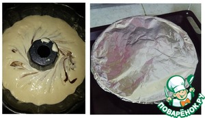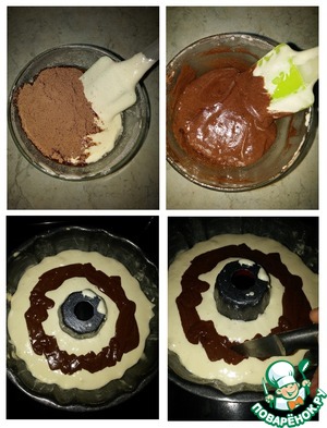 Тесто выкладываем в форму, смазанную маслом, но не все... приблизительно 2 ст. л. оставляем и смешиваем с какао, потом какао-массу аккуратно бороздой выливаем по середине кекса (как на фото), если тесто с какао сильно уплотнилось, добавьте подсолнечного масла. Начинаем перемешивать ножом, делаем круговые движения и одновременно, не спеша, вращаем форму с тестом (я делала два полных вращения формы)