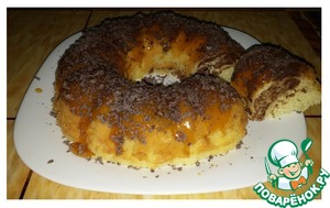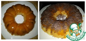 По окончании времени достаем кекс из духовки, снимаем фольгу (она отходит легко), даем остыть в форме, потом перекладываем мскуту на тарелку, смазываем джемом и присыпаем шоколадной стружкой, она может быть из любого шоколада.