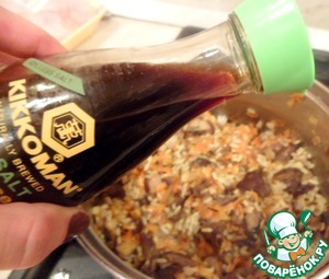 Добавить к ним грибы, обжарить, смешать с отваренным рисом, 2ст. л. соевого соуса ТМ «Киккоман», добавить базилик и соль по вкусу.