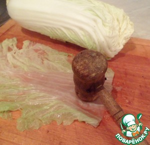 Отварить листья китайской капусты в течении 5 минут и аккуратно отбить белую часть лица деревянным молоточком.
