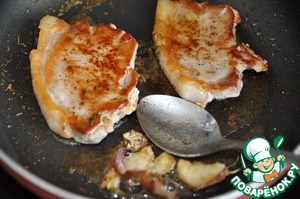 Поливаем мясо получившимся ароматным мясным соком, это ускорит процесс приготовления и сделает отбивные сочнее. Жарим мясо ещё 3-4 минуты.