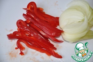 Перец чистим от семян и перегородок и режем длинной соломкой.