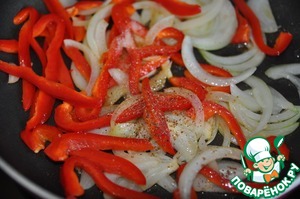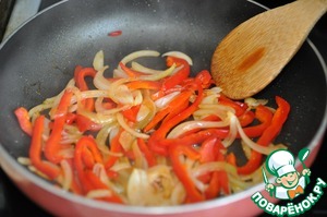 На сковороду наливаем 1 ст. ложку оливкового масла. При появлении лёгкого дымка, кладём порезанные перец и лук. Пережариваем пару минут, добавляем соль, перец и сахар. Сахар поможет размягчить перец и карамелизирует лук. Жарим на высокой температуре, помешивая. Шипение должно быть постоянно, так как если его не будет, овощи начнут вариться, а не жариться.