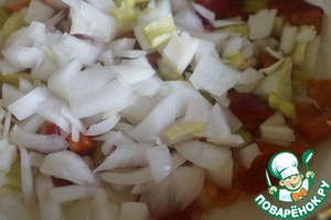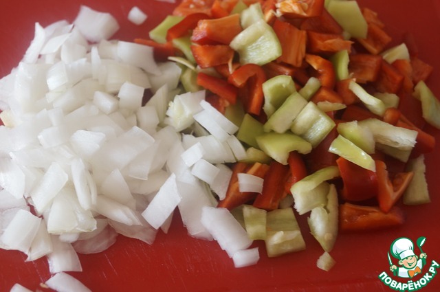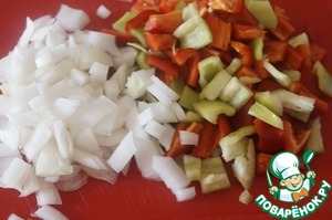 Лук мелко порезать, перец нарезать небольшими кубиками.